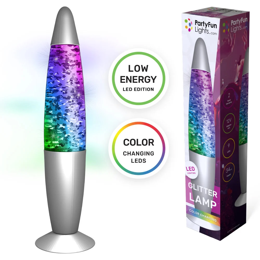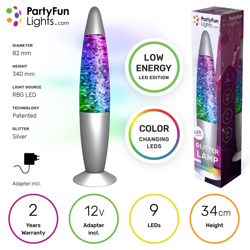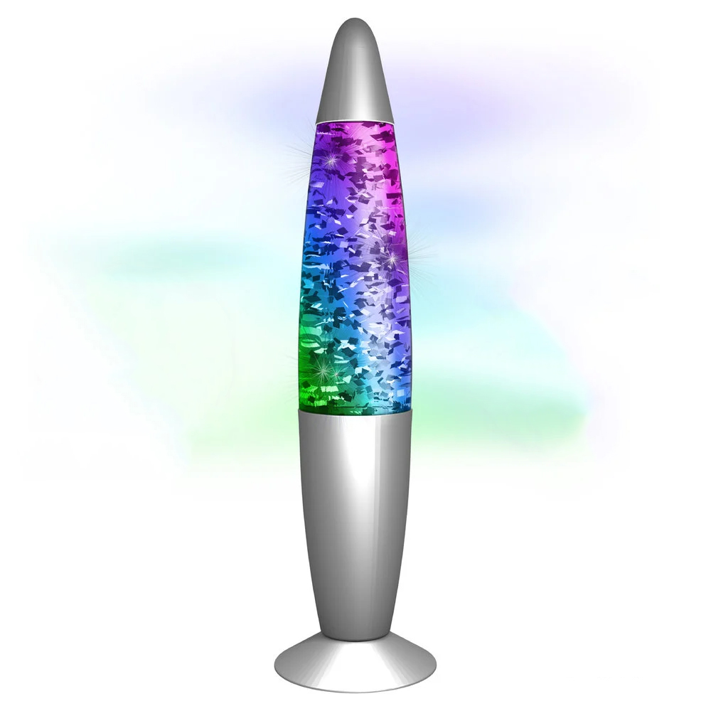 This silver glitter lava lamp is a real eye-catcher, combining the iconic retro design with modern color-changing lighting. As soon as you switch on the lamp, the glitters start to move slowly inside the glass reservoir, while the built-in multicolor lighting continuously changes color. This creates a soothing, hypnotic, and atmospheric effect, perfect for relaxation, decoration, or as a night lamp.