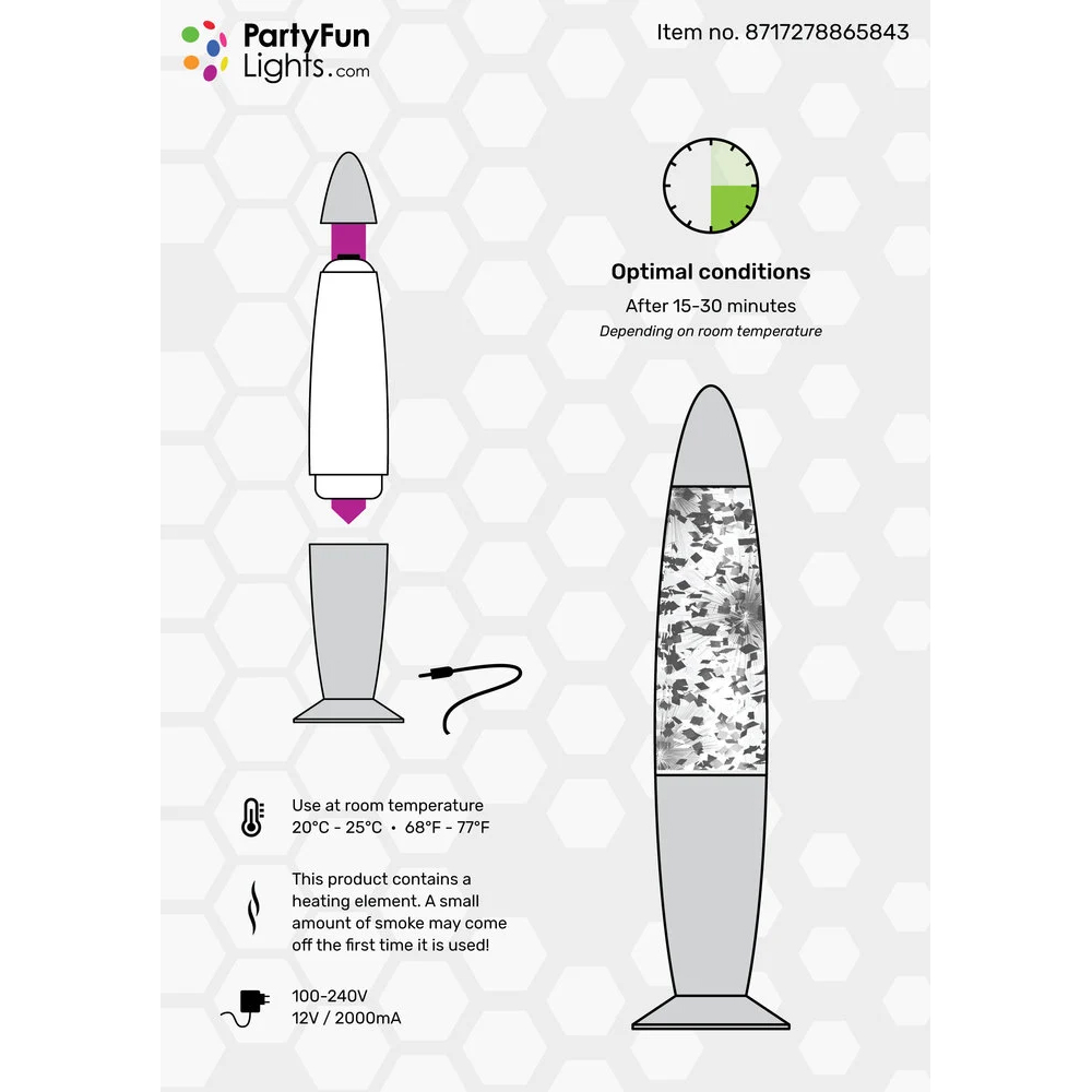 Let yourself be enchanted by the hypnotic effect of this silver glitter lava lamp, a perfect blend of retro charm and modern lighting. Whether you use it to relax, brighten up your interior, or as a night light, it always creates a calming and atmospheric ambiance. Thanks to its striking design, it fits anywhere and continues to be a real eye-catcher, both on and off. Switch it on and enjoy the soothing play of moving glitters and colorful light, time and again!