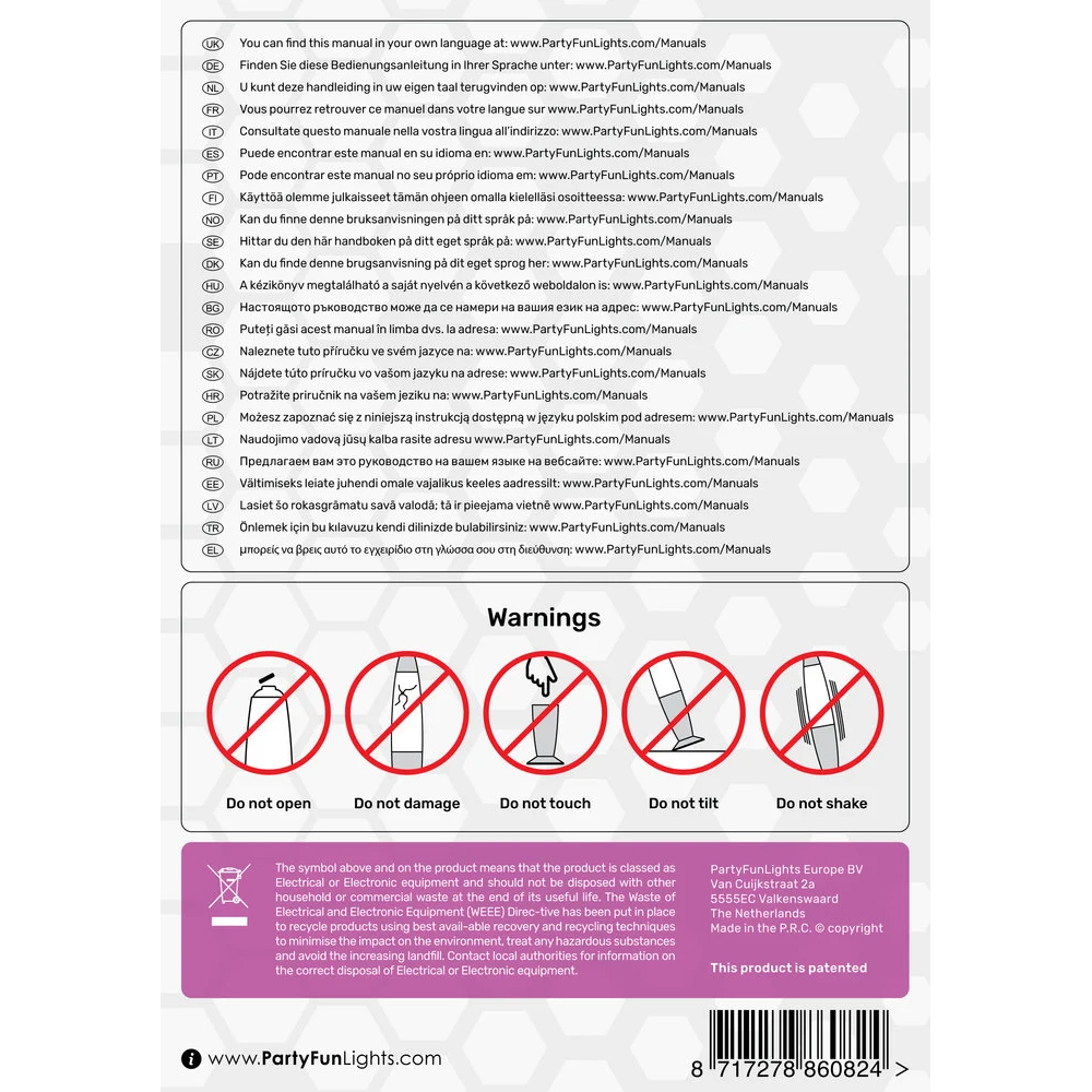 The lamp runs on mains power and comes with a safe low-voltage adapter of 20 watts. The combination of heat and light ensures the glitters slowly rise and fall again, creating the classic lava lamp effect this lamp is known for.