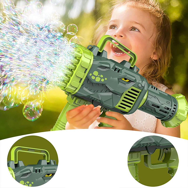 With this cool dinosaur bubble gun, you can shoot dozens of bubbles simultaneously into the air through the 32 holes! The gun is made of plastic, and comes with 1 bottle of bubble solution. The gun operates on 2 AA batteries (not included). Pour the bubble solution into the bubble tray and dip the top of the water gun into the suds. Now pull the trigger, and the air will fill with bubbles through the 32 holes! With this dino bubble gun, you’ll enjoy hours of playtime! It also includes a sticker sheet with 4 stickers, so you can apply the eyes and spots of the dinosaur onto the gun yourself. The gun is great to take with you to your favorite parties and festivals. You can easily carry it with the convenient handle.