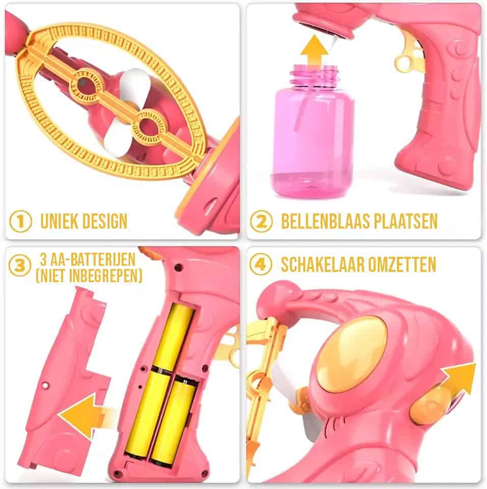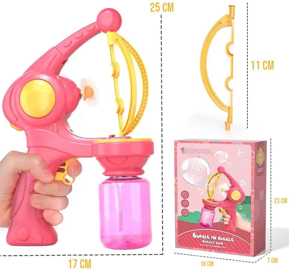 With this cheerful pink bubble gun, you can shoot large and small bubbles into the air simultaneously! The gun is made of plastic and comes with a pot of bubble solution. This gun has a unique design with 1 large hole and 2 small holes, making it possible to blow small bubbles inside a large bubble. The gun operates with 3 AA batteries (not included). Screw the bubble solution pot onto the gun and switch on the fan. Now press the handle and wait 3 to 5 seconds for the bubble solution to be pumped up. Then a large bubble will form with all small bubbles inside, and the air will be filled with bubbles. With this bubble gun, you can enjoy hours of fun! It’s also great to take along to your favorite parties and festivals.