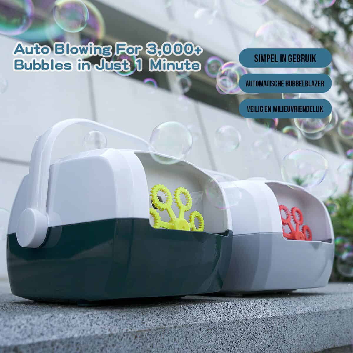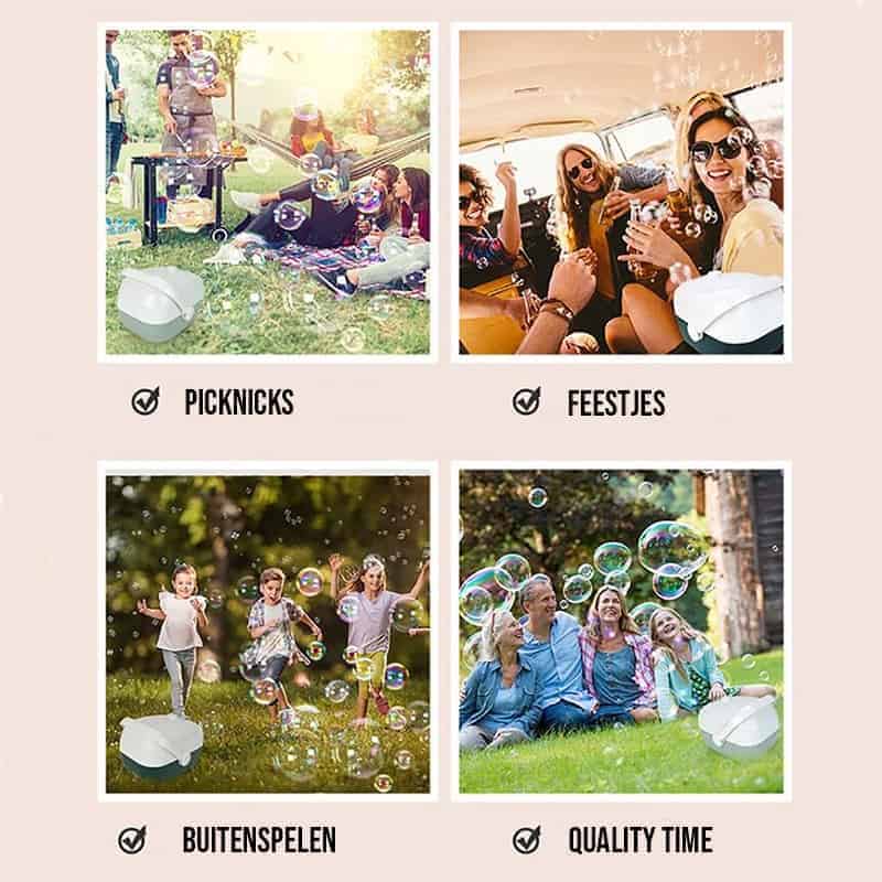 With this bubble machine, you can create more than 3000 bubbles in just 1 minute! Fill the reservoir with bubble solution and turn on the machine with the button on top. The wheel with small holes rotates through the solution, filling the holes with bubble mixture. The wheel then passes by the fan, which blows the beautiful soap bubbles into the air, thousands per minute! Place the bubble machine in the garden or by the pool for a fun effect or use it at other special occasions. After use, easily pour the leftover bubble solution back into the bottle and clean the machine with a dry cloth. The bubble machine runs on 4 AA batteries (not included) and comes with 1 bottle of bubble solution. The practical handle makes it easy to take the bubble machine anywhere. Perfect for use in the garden, at a children’s party, or to take to your favorite festival or event. The possibilities are endless!