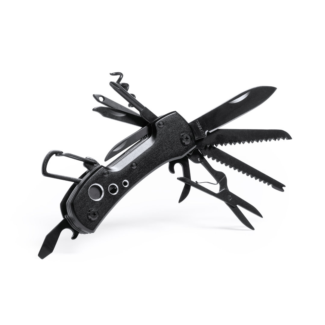 - A robust multitool with various functions, such as a knife, screwdriver, can opener, and more.