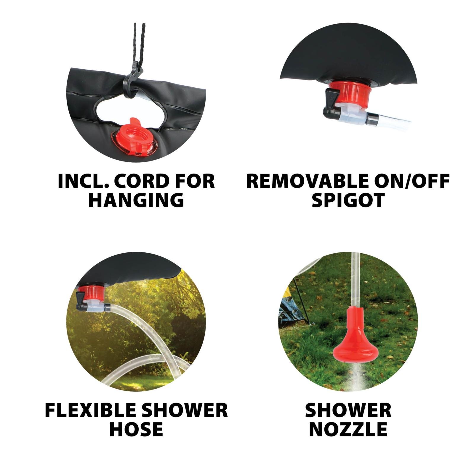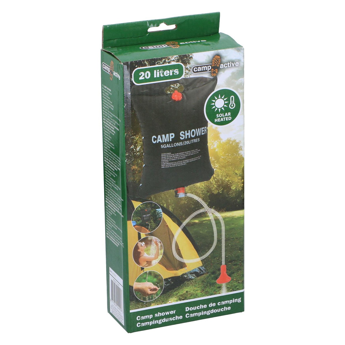 The Camp Active camping shower 20 liters is the perfect solution for a refreshing and comfortable shower at the festival campsite! With a capacity of 20 liters, you have enough water for multiple showers—ideal for freshening up after a long day of partying at the festival. Thanks to the black exterior, the water is naturally heated by the sun and can reach a temperature of around 40°C after 3 hours of sunlight exposure. This way, you can always enjoy a warm shower without the need for electricity or gas. The camping shower is equipped with a flexible hose, a handy shower head, and a removable on/off valve, allowing you to easily control the water flow yourself. With the included cord, you can securely hang the bag from a tree, tent, or other structure. Its compact and lightweight design makes it easy to take along in your festival gear or camping equipment. In addition to festivals, this shower is also perfect for camping holidays, beach days, or outdoor activities. With the Camp Active camping shower 20 liters, you’re always guaranteed a fresh start—even in the middle of the festival campsite!