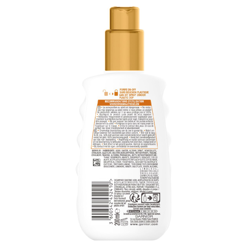Protect your skin and enjoy a radiant, golden-brown complexion with Garnier Ambre Solaire Ideal Bronze SPF 30. This sunscreen spray combines effective UVA and UVB protection with a formula that helps you develop a beautiful, natural tan. Thanks to its light, non-greasy texture, the spray absorbs quickly without leaving a sticky feeling. In addition, it is water-resistant, so you remain well protected even while swimming or sweating. The convenient spray bottle makes application easy and even, even on hard-to-reach areas.