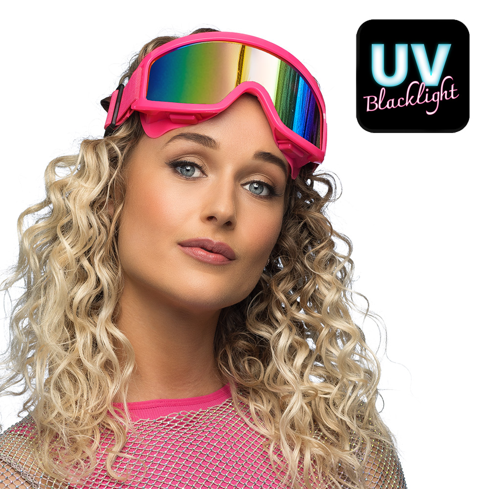 Complete your party outfit with these striking neon pink party ski goggles! These party goggles combine a bold, sporty look with a bright neon color that glows under UV light—perfect for those who dare to stand out. Whether you’re attending a foute party, neon party, carnival, après-ski event, or festival: with these goggles, you’re guaranteed to be the center of attention. The UV-reactive pink color comes spectacularly to life under blacklight, literally making your goggles glow in the dark. The large, reflective, rainbow-tinted lens gives a futuristic flair. The elastic adjustable strap and lightweight design make the goggles comfortable to wear, even through long party nights. The elastic band is easy to adjust to various head sizes and ensures the ski goggles stay securely in place without pinching. Pair these goggles with a retro ski suit, neon mesh top, or other brightly colored accessories to create an eye-catching and original party look. Whether you’re joining a conga line, hitting a dance festival, or attending an 80’s or 90’s theme party, these neon pink UV ski goggles will complete your outfit. An essential accessory for partygoers who love color, style, and attention!