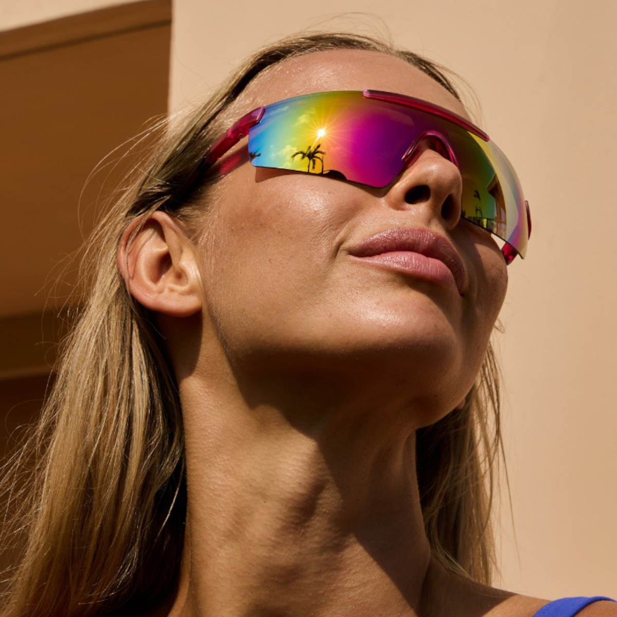 Experience stylish sun protection with our pink sports sunglasses featuring a semi-rimless frame and multicolor mirrored lenses. These sunglasses combine style with practical functionality. The mirrored lenses complete the look while reducing glare and promoting clear vision, even in bright sunlight. Designed for comfort, these sunglasses reflect that in every detail. The lightweight frame makes them easy to wear all day, while the pink matte arms provide a secure fit regardless of your face shape. This way, you won’t have to worry about the glasses slipping off. Whether you want to give your style a boost, protect your eyes, or simply add a touch of confidence to your look, our pink sports sunglasses with a semi-rimless frame and multicolor mirrored lenses are the perfect choice.
