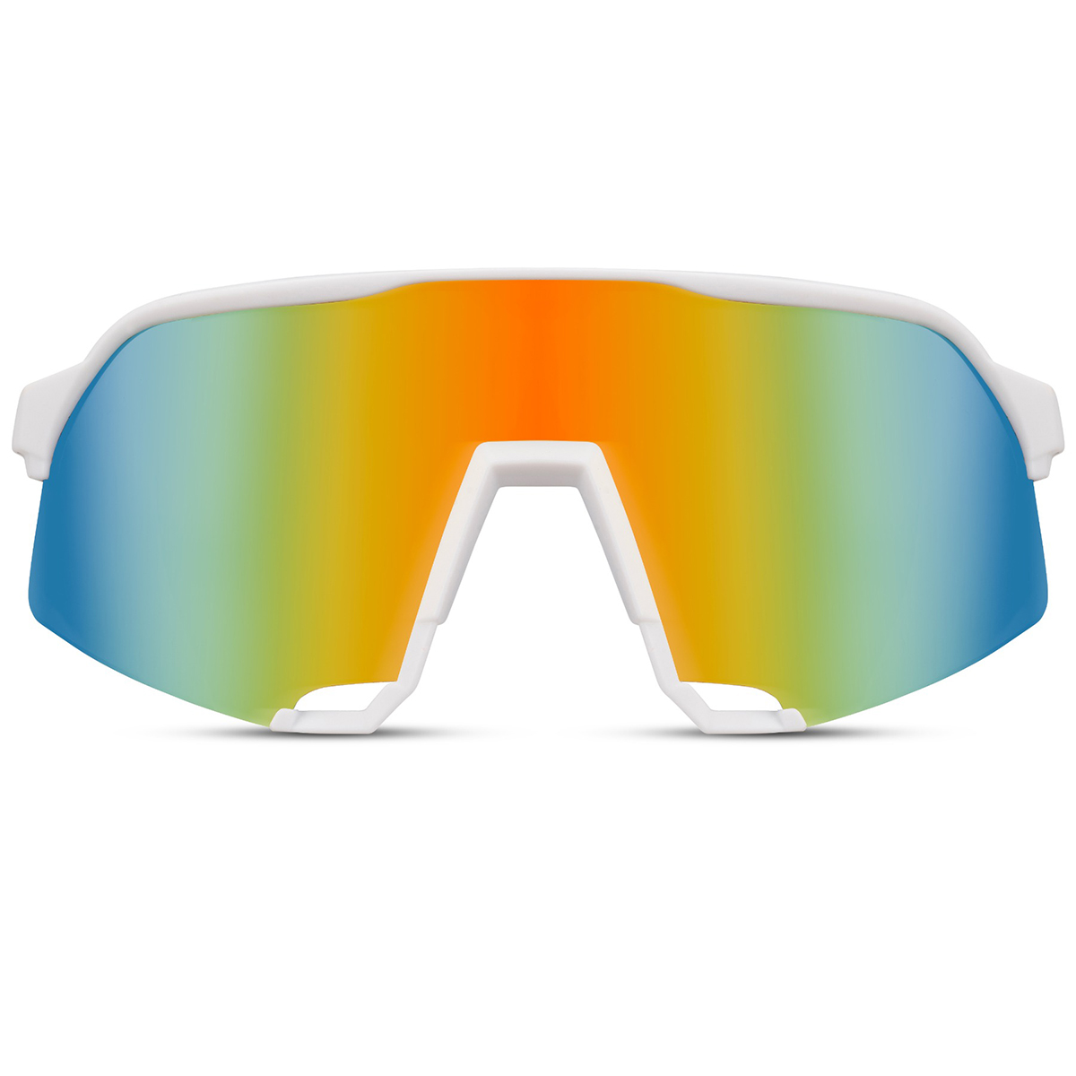 Experience stylish sun protection with our white sports sunglasses featuring a semi-rimless frame and multicolor mirrored lenses. These sunglasses combine style with practical functionality. The mirrored lenses complete the look while reducing glare and providing clear vision, even in bright sunlight. These sunglasses are designed for comfort, and you’ll notice it in every detail. The lightweight semi-rimless frame ensures effortless wear, while the white temples provide a secure fit regardless of your face shape. That means you don’t have to worry about the sunglasses slipping. Whether you want to boost your style, protect your eyes, or simply add a touch of confidence to your look, our white sports sunglasses with semi-rimless frame and multicolor mirrored lenses are the perfect choice.