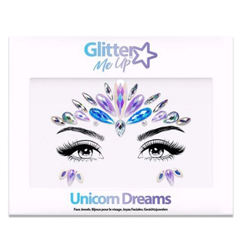 The PaintGlow Glitter Me Up Face Jewel Unicorn Dreams is a reflective, multicolored, removable facial jewelry set. The set is made of colored crystal stones and can be worn for a long time on the forehead and around the eyes. The facial jewels are easily applied and removed and can be reused with the Glitter Fix Gel after cleaning the stones. The perfect accessory for an unforgettable festival, carnival, or special occasion!