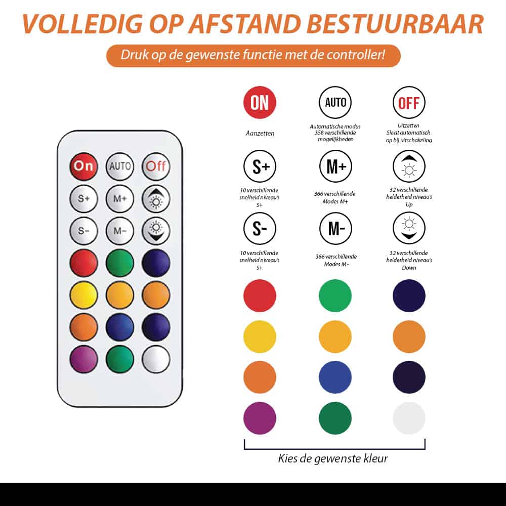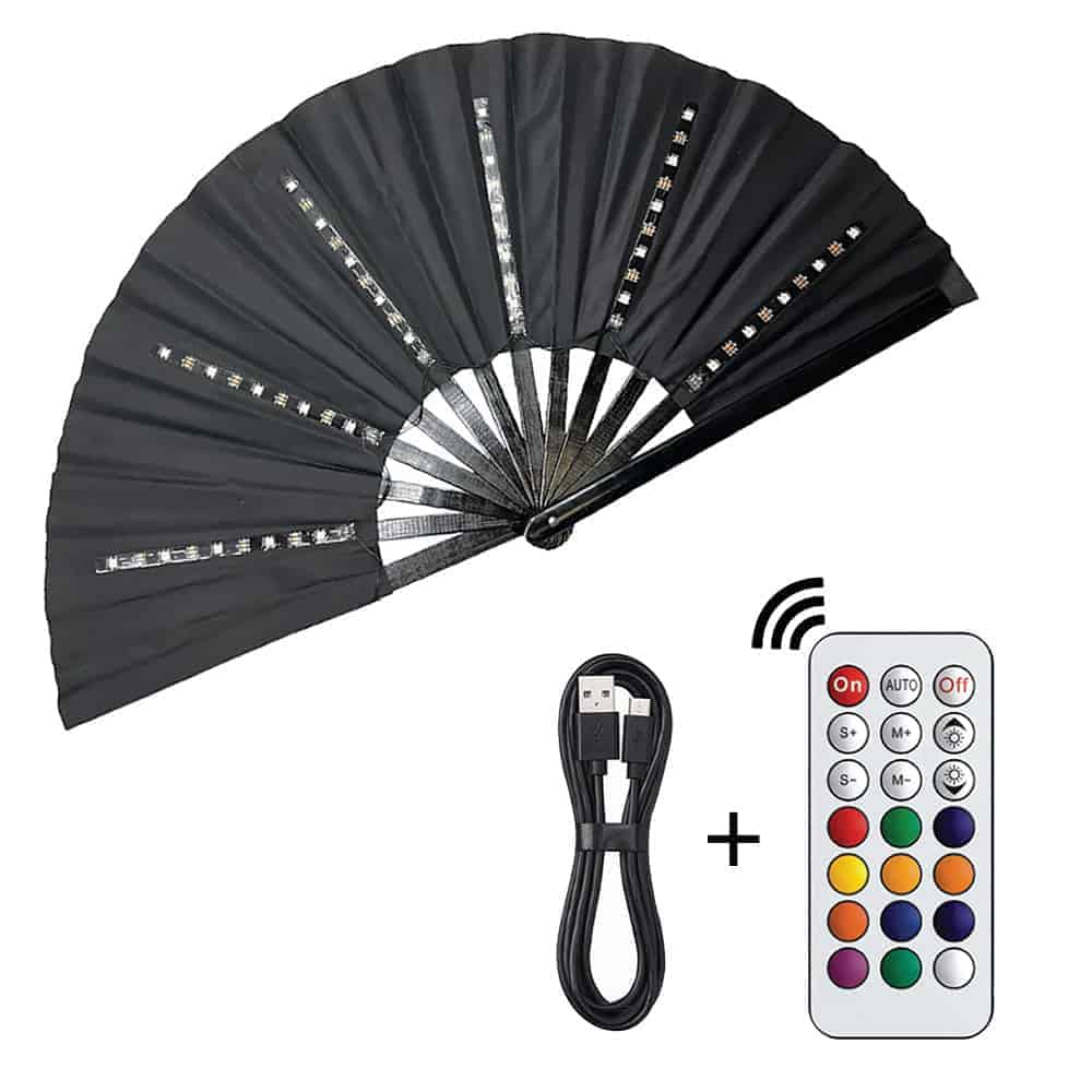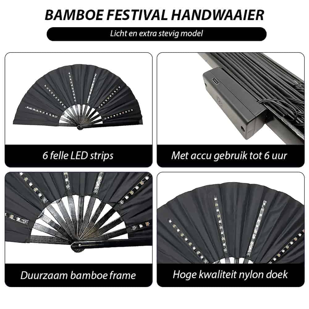 You can click through the different effects in automatic mode with the Mode+ and Mode- buttons. It is also possible to adjust and dim the brightness and speed of the lighting. A fully charged battery lasts up to 6 hours! Combine the fan with your most beautiful festival outfits and you will definitely be the center of attention! The fan is also the ideal recognition point in the crowd if you lose your friends. You just have to hold the fan with the agreed color in the air and your friends can see you from a distance. This beautiful festival fan is the trend for the 2023 festival season! Make your festival experience even more complete now and let the parties come!