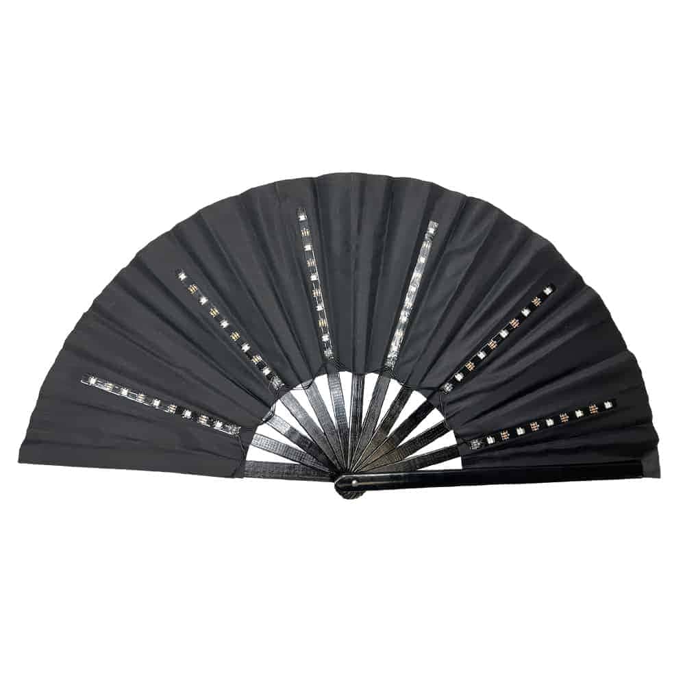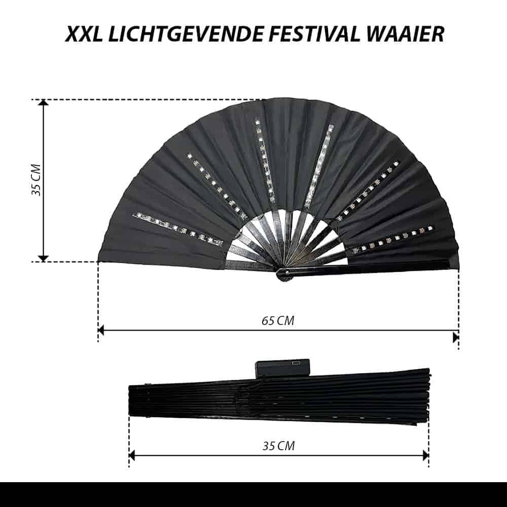 On a hot festival day, a hand fan is indispensable for a refreshing cool down! Do you love being the center of attention? Then this Disco Fan XXL festival fan with LED lighting is perfect for you! The Spanish fan is made of plastic with a polyester fabric and is extra sturdy. With a width of 62 cm and a height of 32 cm, this fan is extra large and will provide even more cooling! The fan has a built-in battery and is easy to charge with the included USB C cable. Turn on the lights with the on and off button on the fan itself and the colors will now flash in sequence. A remote control is also included, giving you many more options!