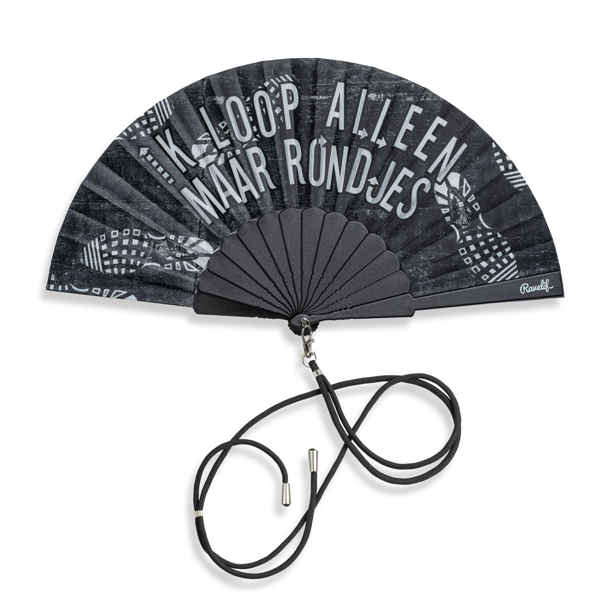 The Ravelife HangFan is the trend for anyone who wants to combine style, humor, and comfort. This popular hand fan, a bestseller for years thanks to the iconic “Ik Loop Alleen Maar Rondjes” print, is now also available as a practical version with neck cord. The plastic frame makes the fan extra light and durable, while the classic print provides a striking festival look.