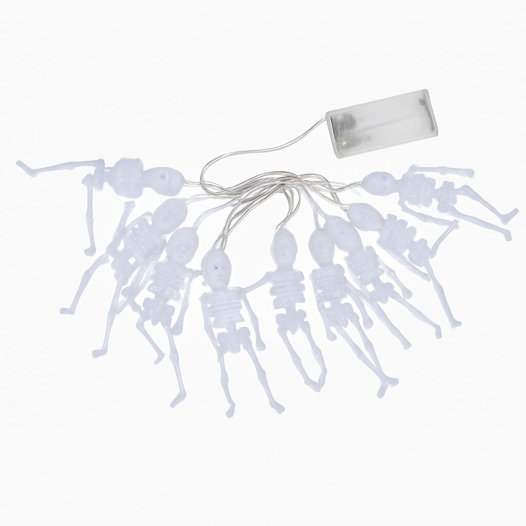 Turn your house into a spooky spectacle with the Halloween skeleton string lights! This unique decorative string is 1.5 meters long and features several white, translucent skeletons illuminated by bright LED lights. As soon as you switch on the string lights, the skeletons seem to glow in the dark—a perfect decoration for Halloween parties, themed nights, or trick-or-treat setups. With a height of 14 cm per skeleton and a total length of 1.5 meters, this LED garland is ideal for hanging along walls, windows, doors, or furniture. The subtle yet striking lighting provides just the right amount of suspense and atmosphere. Whether you’re decorating indoors or styling a sheltered outdoor space, this garland fits anywhere. The string operates on 2 AA batteries (not included), so you don’t need a power outlet and can place it anywhere you like. The transparent wire makes the lighting extra stylish, keeping the focus entirely on the illuminated skeletons. Combine this decoration with spider webs, pumpkins, ghosts, or bloody tablecloths for a terrifyingly complete look. This Halloween skeleton garland is not just a real eye-catcher at parties, but also reusable. After Halloween, you can easily store it away to bring back the spooky ambiance again next year. With this skeleton string light, you can transform any space into a haunted experience full of light, atmosphere, and spine-chilling coziness, ready to give your guests the shivers during Halloween!