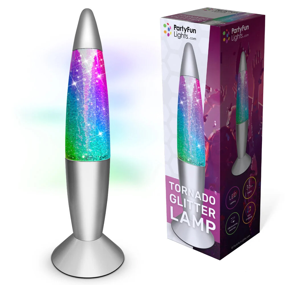 Bring magic and atmosphere into your home with this stylish silver tornado glitter lamp, 36 cm high. This decorative mood lamp creates an impressive tornado effect with glitter continuously swirling around in the water. Combined with the built-in multicolor RGB LED lighting that changes color automatically, this results in a calming, hypnotic, and fascinating light effect.