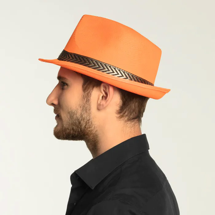 Complete your party outfit with this funky neon orange fedora hat, the accessory for those who want to stand out! The hat is made of polyester, providing a sturdy shape and long-lasting wearing comfort. Thanks to the UV blacklight reaction, the band of the hat glows brightly under blacklight, making you literally shine in the dark—perfect for clubs, festivals, King’s Day, or themed parties. With a diameter of 59 cm, the hat fits most head sizes. The design features a classic fedora shape with a modern twist: a shiny black band with a zigzag pattern that gives it a stylish, playful look. The lightweight fabric and sturdy fit make this hat comfortable to wear, even during long parties. Its vibrant orange color makes it perfect to match with orange outfits or themes like Holland, summer, or disco. Moreover, it’s easy to combine with other accessories, such as sunglasses or boas. Whether you’re celebrating King’s Day on the streets, dancing at a festival, or attending a blacklight party, this blacklight UV-reactive party hat will ensure all eyes are on you!