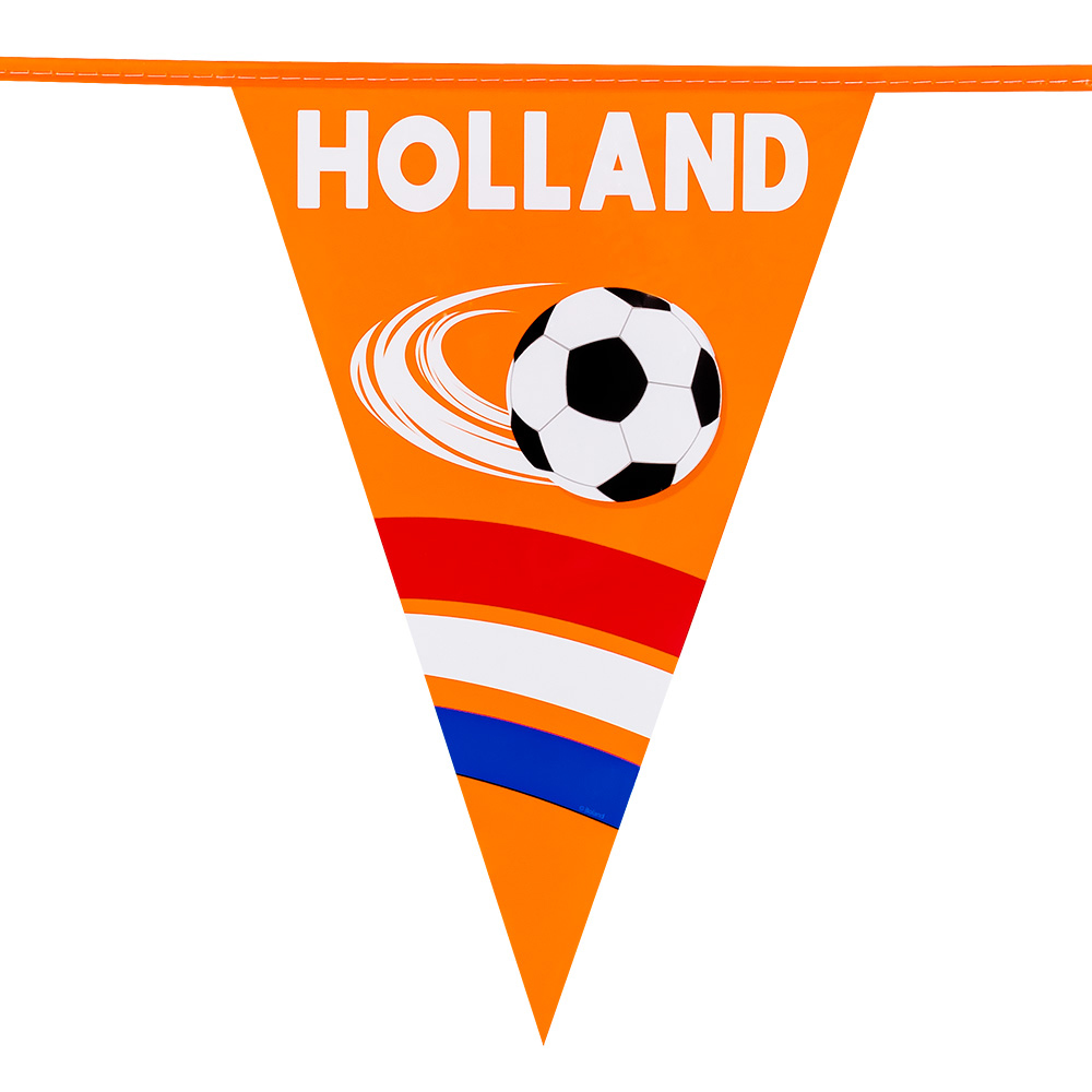 Show your Dutch pride with this Holland pennant banner, the must-have decoration for every Oranje fan! Whether you’re cheering on the Dutch national team during the European or World Cup, or decorating the street for King’s Day or Liberation Day, this pennant banner instantly creates a festive and patriotic atmosphere. The banner features 15 triangular flags of 20 x 30 cm (W x H), printed with a striking football design and the text “HOLLAND” in bold white letters. The combination of orange with red, white, and blue accents refers to the colors of the Dutch flag and brings every location into true supporter spirit. Made from polyethylene, this banner is sturdy, tear-resistant, and weatherproof. This makes it ideal for both indoor and outdoor use, whether in the garden, on the balcony, in the street, or during a sports event. The flags are printed on one side, so the colors stay vibrant and eye-catching, even with prolonged use or sunlight exposure. With a length of 6 meters, you can easily decorate large areas and reuse the banner multiple times. Its lightweight construction makes it easy to hang with string, tape, or clips, and after use, you can quickly store it away. Pair this banner with other orange party items like balloons, horns, or hats for a complete Oranje atmosphere at any party or tournament!