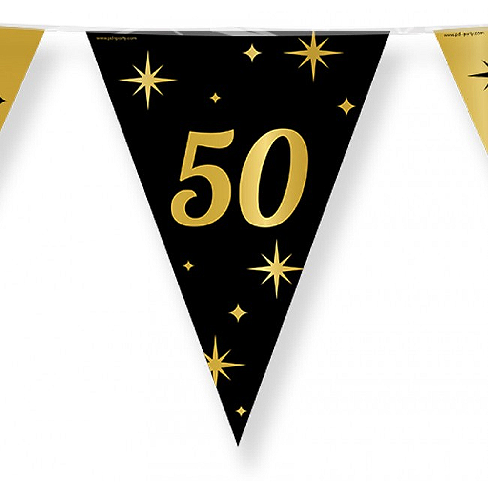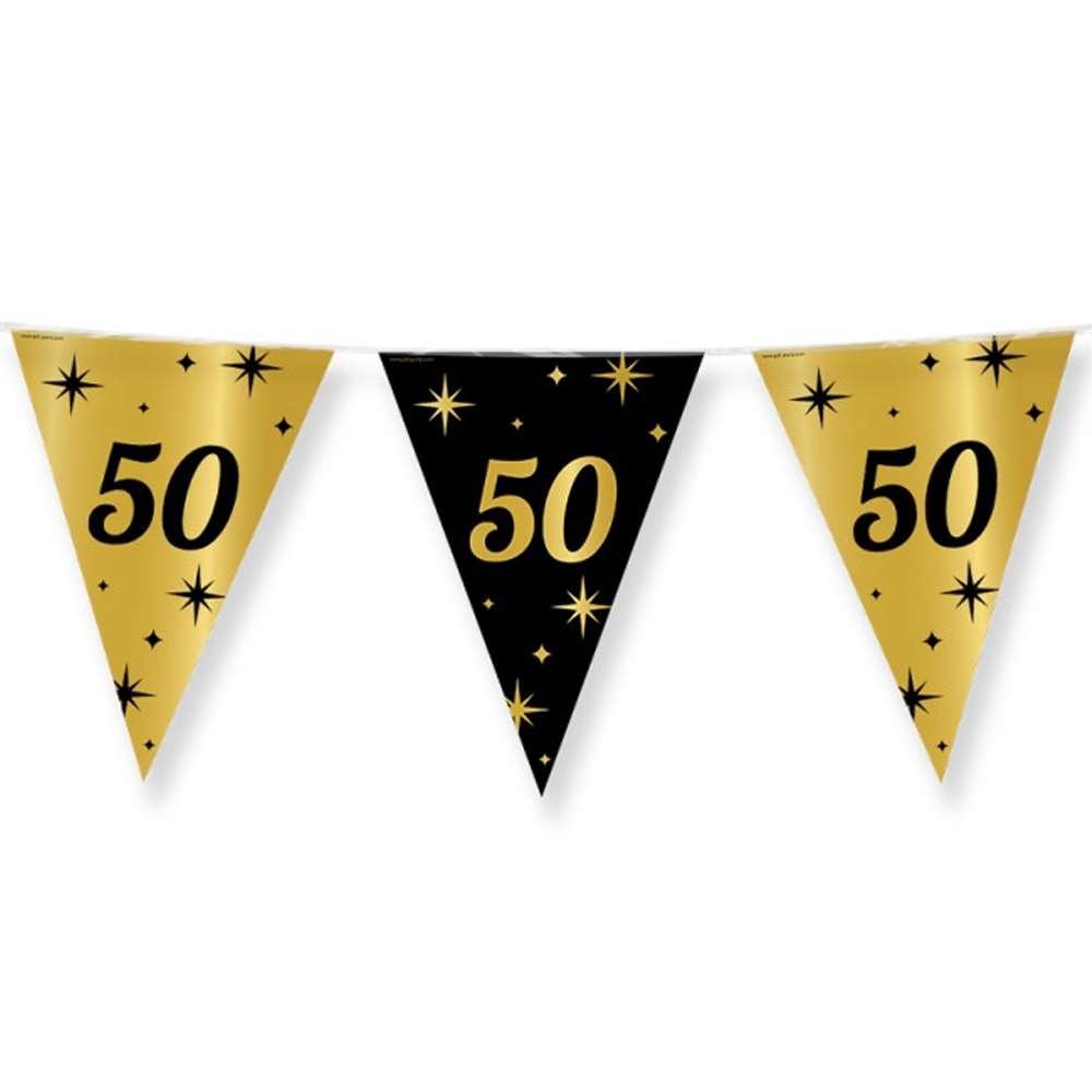 Your 50th birthday is an important milestone that you never want to forget. With this beautiful gold and black bunting line you add a touch of festivity to this special day. The line has a chic design, is made of high-quality foil material and is 10 meters long. You can easily hang the line by tying the ends to something. This way, you can hang the flags on walls, ceilings, tables or anywhere you want. It makes the space even more festive. This beautiful gold and black bunting line will make your 50th birthday even more festive. Hip hip hooray!