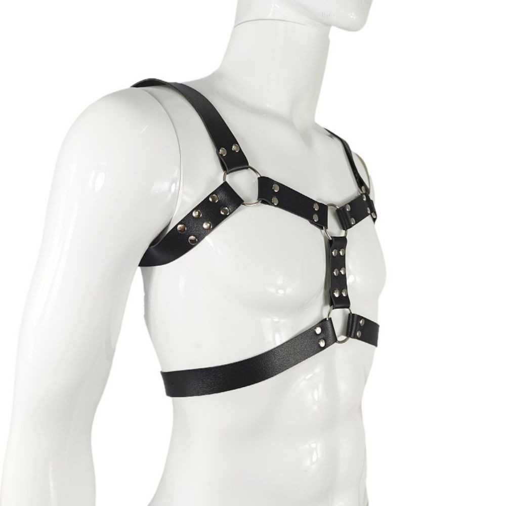 Let your powerful side speak with this bold black body harness for men! The sleek design with sharp lines, silver-colored metal rings, and studs gives an edgy and robust look that accentuates your torso and highlights your confidence. The adjustable buckles at the neck and on the back ensure a comfortable and perfect fit, no matter your body type. Wear it shirtless or over a top: this harness effortlessly adapts to your vibe. Perfect for festivals, pride parades, raves, or an intense techno night. But it also works as a playful accessory in the bedroom. A must-have for anyone with guts. Complete your look with this statement piece and show who you are. Ready to command attention?